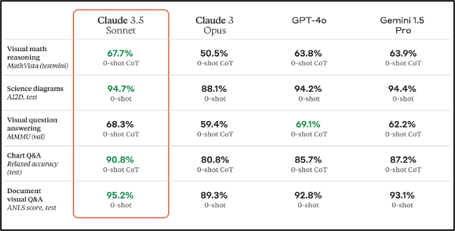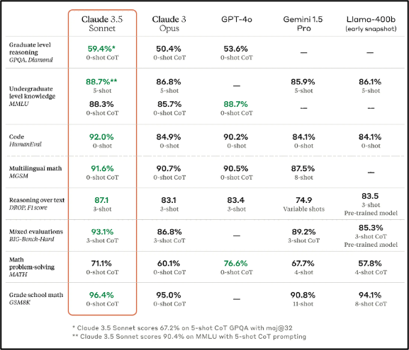 Claude 3.5 Sonnet은 벤치마크 점수에서 다른 생성형 모델에 비해 우수한 성능을 보였습니다.