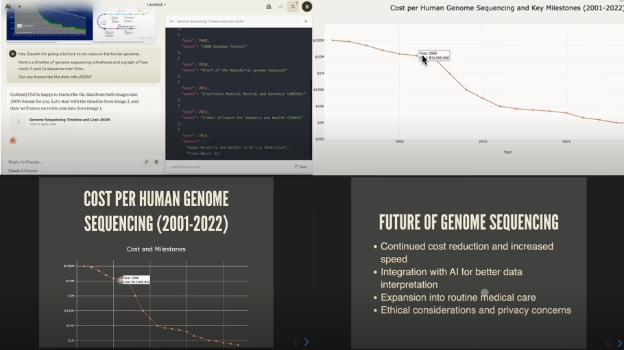 이미지를 첨부하고, 클로드 3.5 소네트가 Json으로 읽은 다음 다시 새로운 그래프를 만들어주고, 이걸 다시 PPT슬라이드로 만들어줍니다.