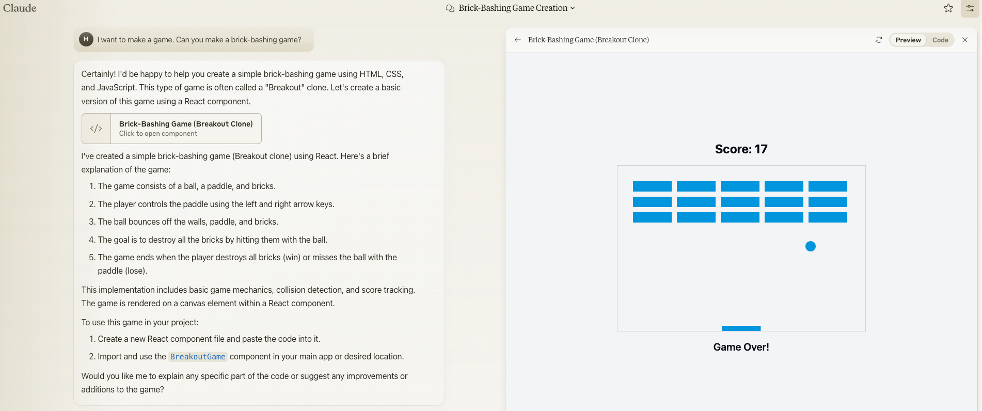 텍스트로 질문하면 알아서 빠르게 코드를 작성하면서 순식간에 단 몇 번의 질문으로 게임을 만들어 냈습니다.😱