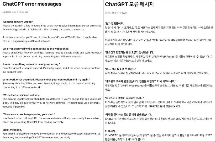 두 번째 유형의 메시지가 발생하였으면 네트워크 연결 상태를 확인하시거나 VPN 또는 보안 프로그램을 활성화하신 분들은 설정을 꺼셔야 합니다. 인터넷에서 ChatGPT와 충돌이 일어났기 때문입니다. (V3, 알약은 제외, 확장 프로그램 사용자)