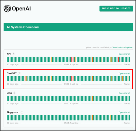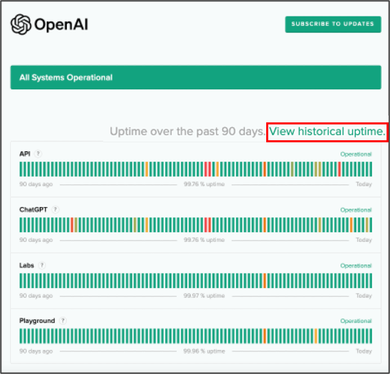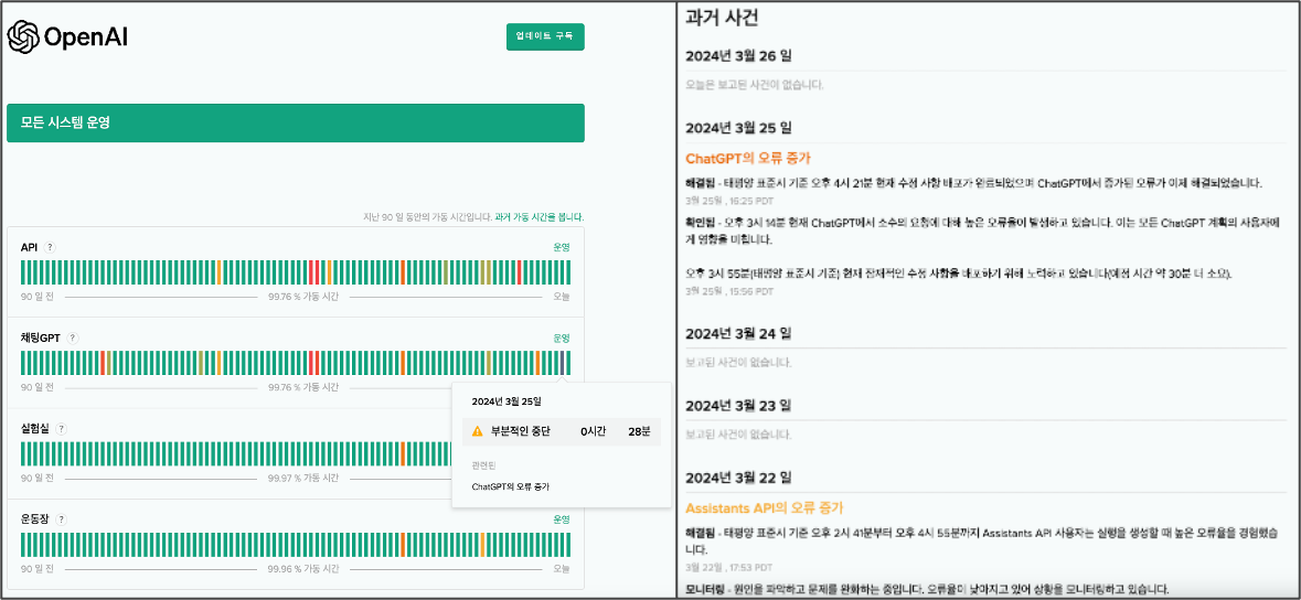 - 추가적으로 위에 1번과 2번을 통해서도 안되시면, OpenAI 상태 확인창에 가셔서 상황 확인하기 (한국과 미국의 시차가 있기 때문에 -1일로 생각하시면 됩니다) - (멈춤 현상과 관련)