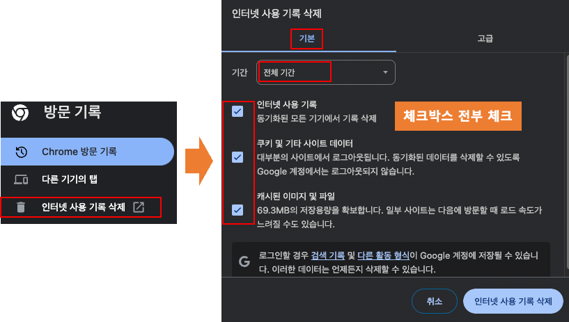 구글 크롬이나 엣지 사용하시는 분들 모두 캐시 삭제해 주시면 됩니다. 캐시삭제하실 때 고급은 안 건드리는 것을 추천드립니다.